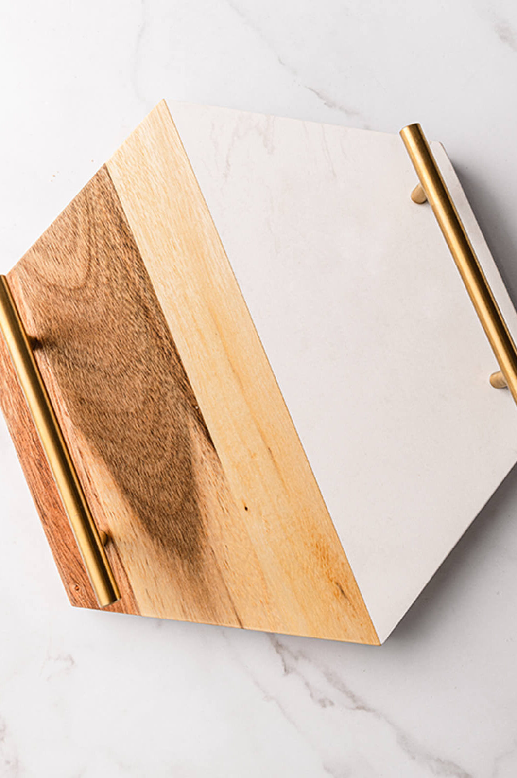 Agregar al carrito de WhatsApp Add to Wishlist AZAFATE HEXAGONAL DE MARMOL Y MADERA CON ASAS METALICAS S/165.00